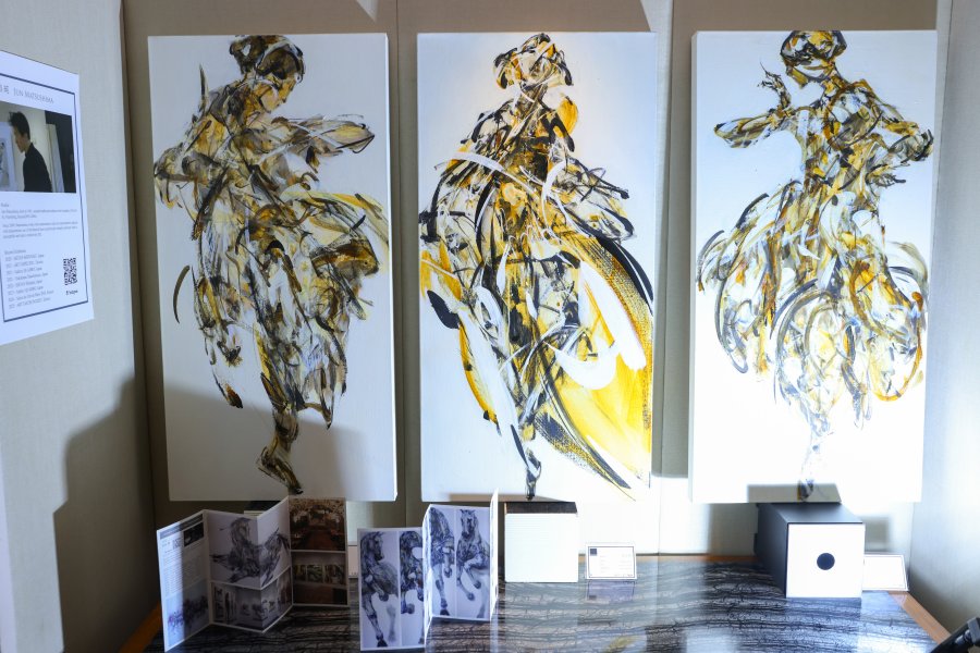 國際亮點同樣耀眼。英國知名畫廊特別展出 Andy Warhol 與 Pablo Picasso 真跡,吸引收藏 家與藝術愛好者爭相排隊參觀; Nick Teeple 帶來互動式數位共⽣裝置、俄羅斯畫家展出極 具情感張⼒的⼤型繪畫、⽇籍畫家 Jun Matsushima 則以充滿動感的作品震撼全場,三位國 際藝術家的作品為展會注入強烈跨⽂化對話。女性藝術家⽅⾯,來⾃英國的印度裔畫家 Anjali Purkayastha 以其標誌性「點與⾊彩」構圖,層層疊疊的⾊點構築出極具個⼈風格的 宇宙;韓國女畫家 YouRim Song 以傳統韓紙,繪出當代抽象風景,完美體現新舊交融之美; 菲律賓華裔畫家 William “Elijahˮ Y. Young 則帶來療癒系⼒作 —— 柔和畫風外,更配合現場散 發的香氣與環境⾳樂,讓觀眾同時獲得視覺、嗅覺與聽覺三重享受,成為最後⼀天很受歡迎 的「療癒⾓落」。